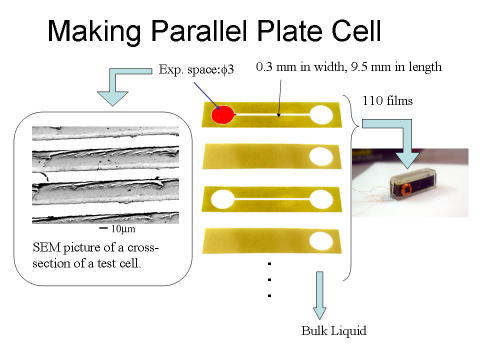 並行平板セルは穴の開いたフィルムと空いていないフィルムを積み重ねることで作成しました。下の図にあるように厚み12.5μmのフィルムに二つの穴とその間をつなぐパスを作成し、厚み25μmのフィルムに右側の穴に対応するフィルムにだけ穴を開けてそれを積み重ねて